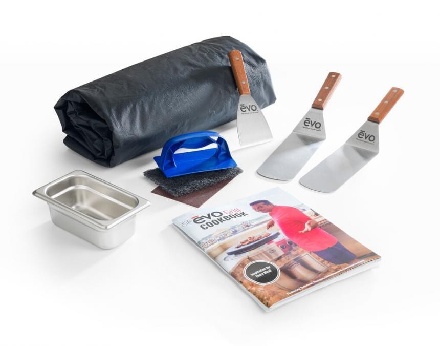 Included with every AGA by Evo Grill, you receive an AGA by Evo Grill Cookbook, 2 stainless steel spatulas, cook surface cleaning kit (handle, pad & screen), stainless steel cook surface scraper and an acrylic cover for when your grill is not in use.